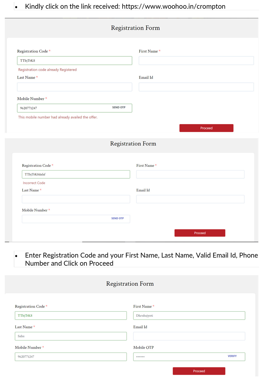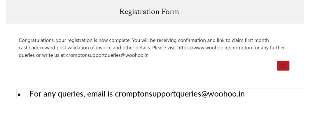 - In order to be eligible for the Cashback, You should register within 30 (thirty) days from the date of the Invoice, failing which Your eligibility will lapse. For assistance you can write to cromptonsupportqueries@woohoo.in