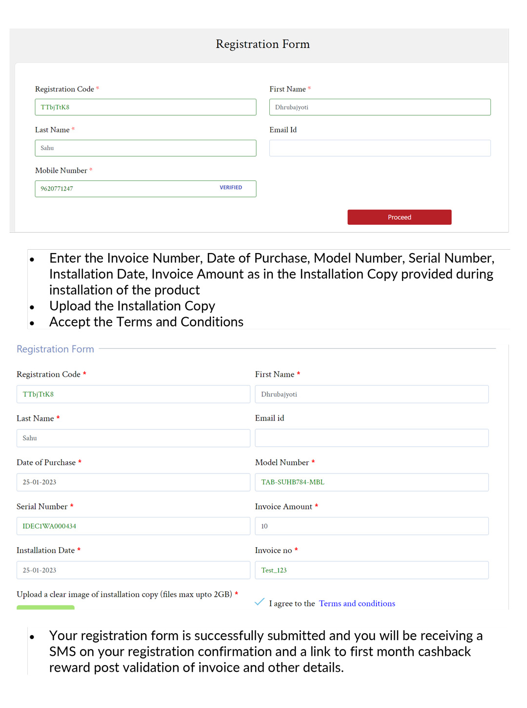 - Post registration, customer will receive a notification stating the registration is successful and he will be receiving the link via SMS to update product serial No. within 24 hours.