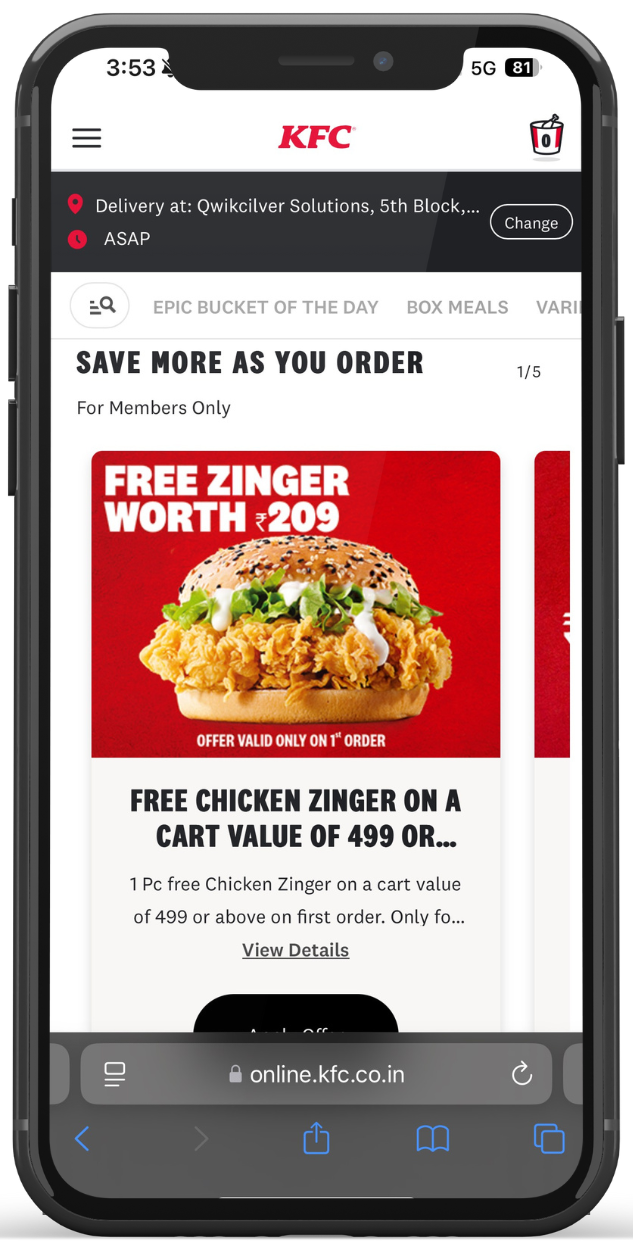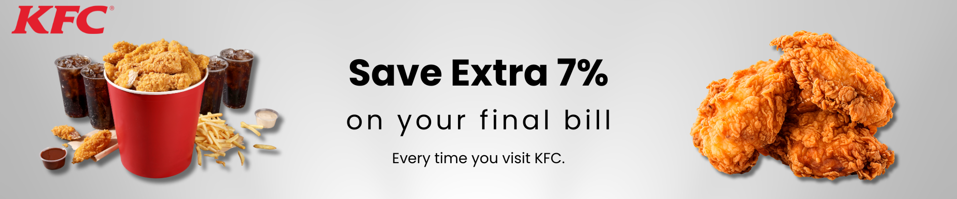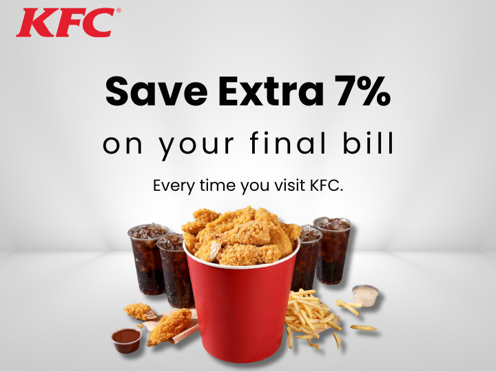 Woohoo, India’s largest gift card store, offers you an instant flat 7% discount on KFC. By using this KFC E-Gift Card as a payment mode, you will get an additional 7% discount on top of all the existing deals on KFC.