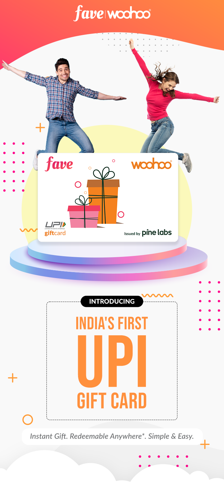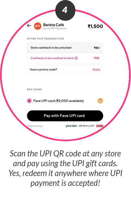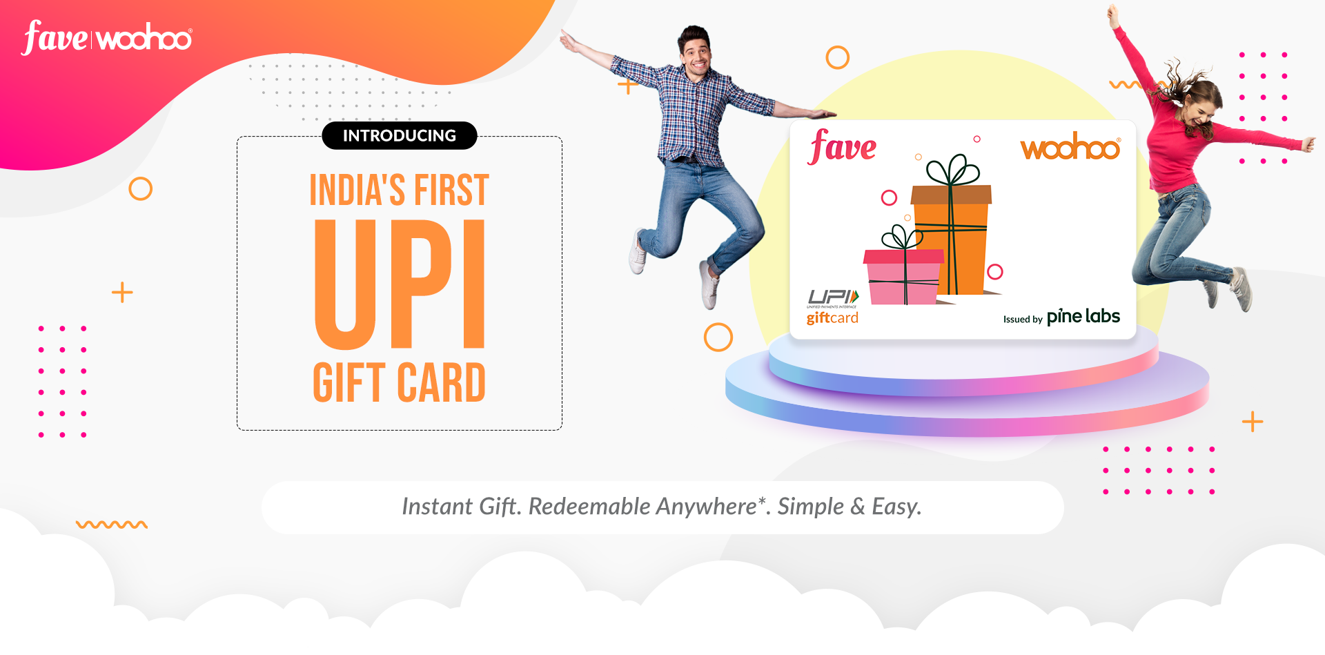 Woohoo, in association with Fave, brings to you the first-ever Gift Card of its kind in India. This Gift Card can be used for any type of purchase at merchants and brands all over the nation. A Fave Woohoo UPI Gift Card allows its holder to make any payment, online or offline, via the balance on the card. So, don’t settle for less-than-perfect gifts anymore. Give the people you care about a Fave Woohoo UPI Gift Card and give them the freedom to buy their own gift from anywhere that accepts UPI payments.