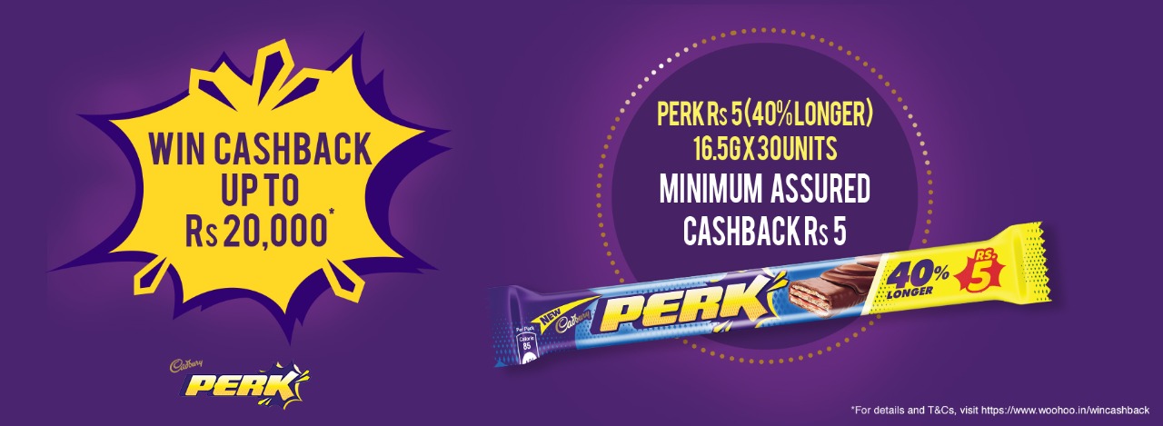 - assured cashback of INR5 or a Chance to win cashback UPTO INR 20,000 on Cadbury Perk tarzan INR5 16.5g x 30 units pack,