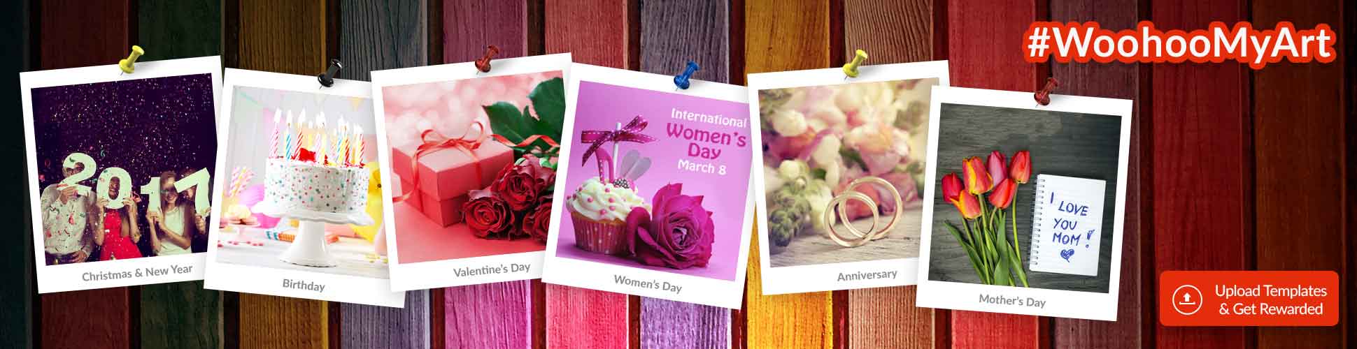 We at Woohoo want your gifts to express not just your love but your uniqueness and creativity as well. And what better way to showcase your skill and talent than to let it spill over on the gifts you send your near and dear ones. Create and upload your designs on our Facebook or Instagram pages. The 5 best designs every month will be selected and showcased on woohoo.in and the Woohoo App. These designs can be used as templates by the whole Woohoo community for sending E-Gift Cards. What's more?? The creators of the selected templates will receive special gifts from Woohoo every time their template is used. Create, innovate and spread joy the Woohoo way with WoohooMyArt.